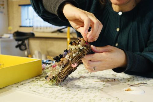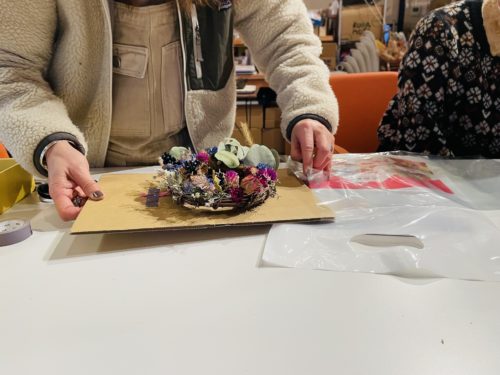向きをそろえながら色んな種類のドライフラワーを刺してゆきます。少しずつ先生の見本に近づいてるかな?