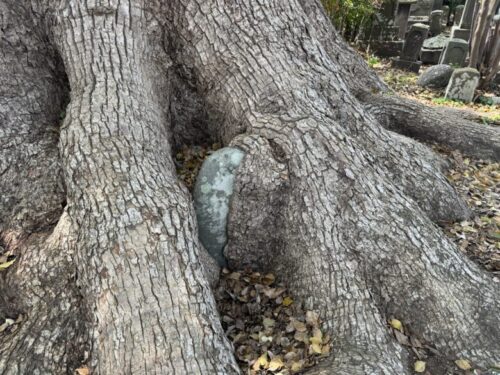 こっちは、飲み込まれてる!!!パッと見ると気が卵を産んだみたいにも見えます。木が生きているというのをものすごく実感します。根本が横口を開けるように、伸びてこんな風になるなんて、びっくりな光景ですね。