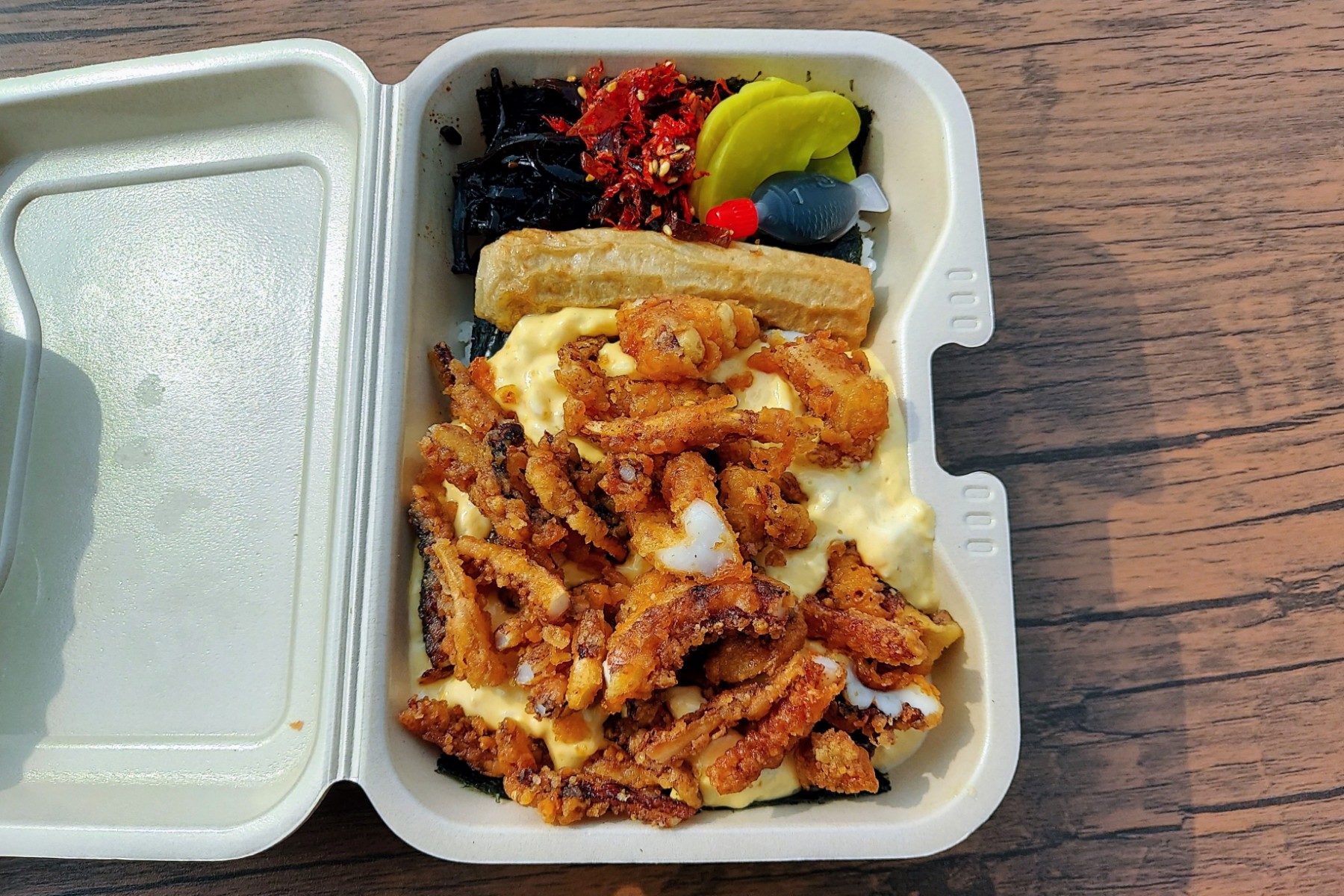 特徴としては、イカゲソのから揚げとちくわ、昆布の佃煮、おかかにたくあん、それとた~っぷりのタルタルが入ったお弁当です。