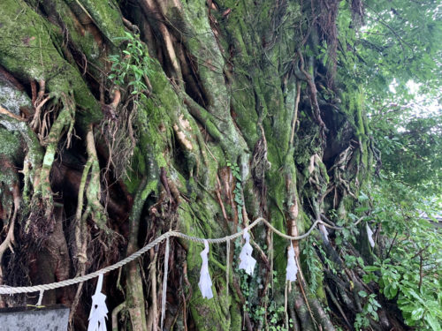 拝殿や本殿を守るようにたたずむ巨木。幹にはしっかりとしめ縄がまかれています。