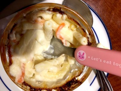 あつっ!冷まして口の中にいれると優しい味のグラタンです。グラタンの具はマカロニ、コーン、人参でなんてシンプルなのでしょう。
