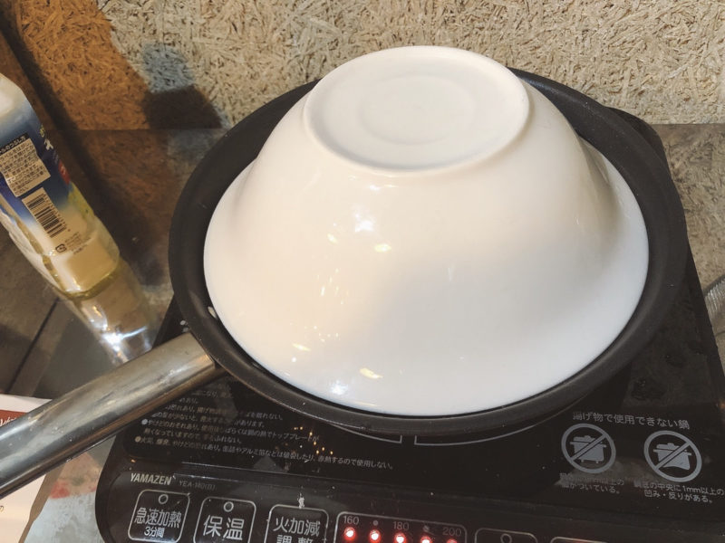 蓋をして(蓋がなかったのでお皿で代用)水が無くなるまで(約5分)蒸し焼きにします。