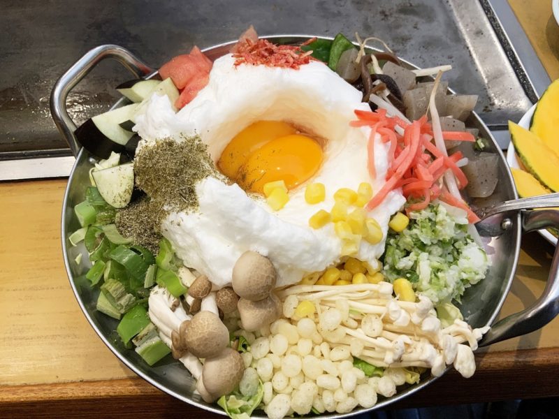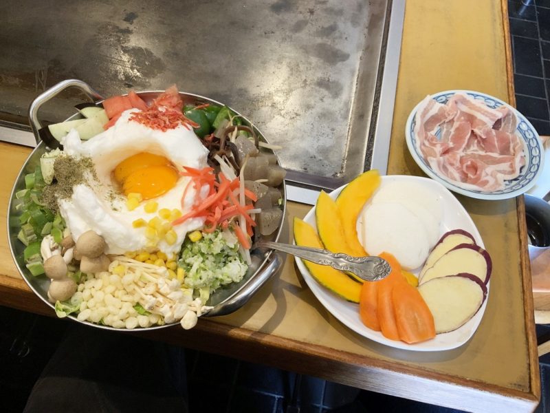 運ばれてきた「なんでも野菜たっぷり焼き」。15種類の野菜がこれでもかというくらいに入っています。これで税別700円ってんだからすごいですよね。
