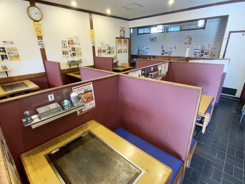 「なかぐま」は昔ながらの席に鉄板があるお店で、自分で焼いて食べることができます。もちろん、お店の方に焼いてもらうのもOKなのですが、