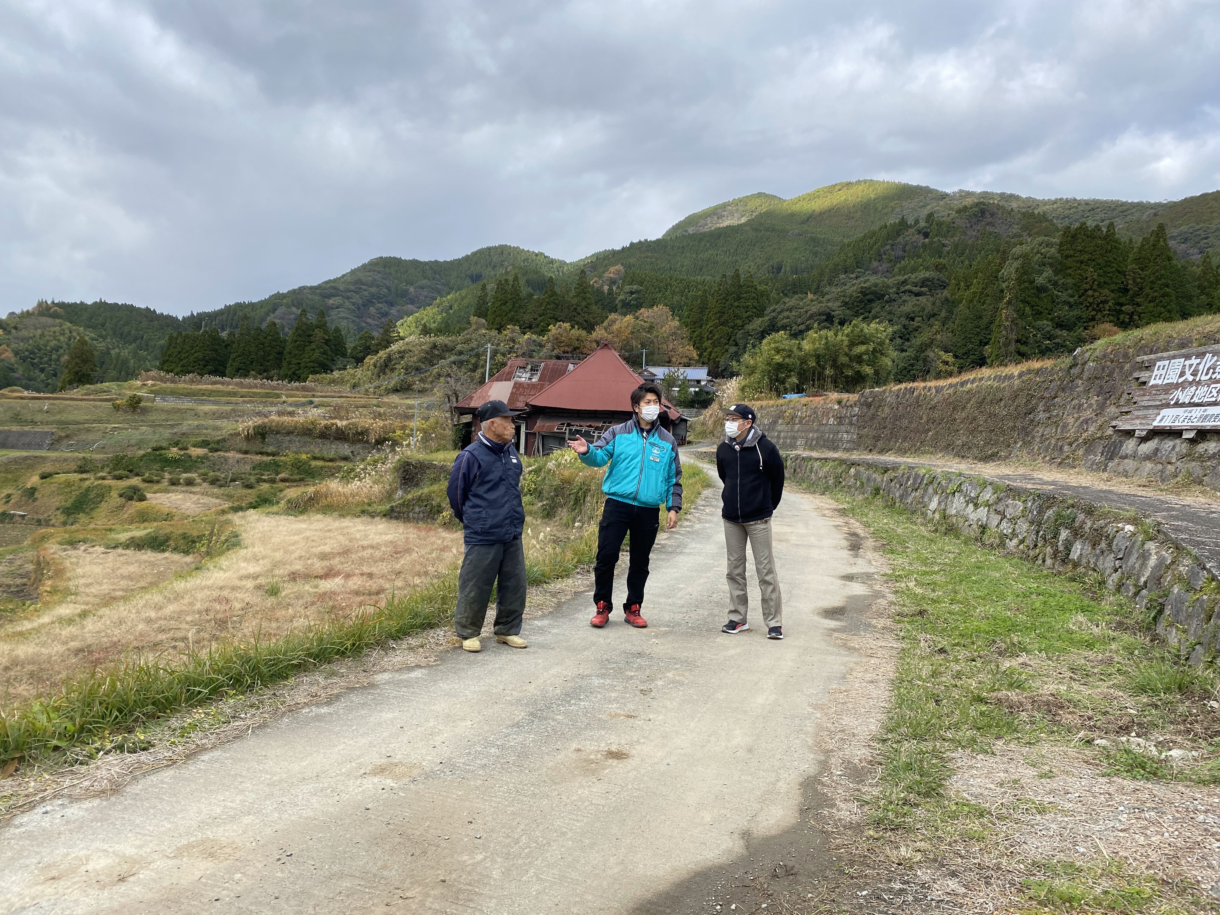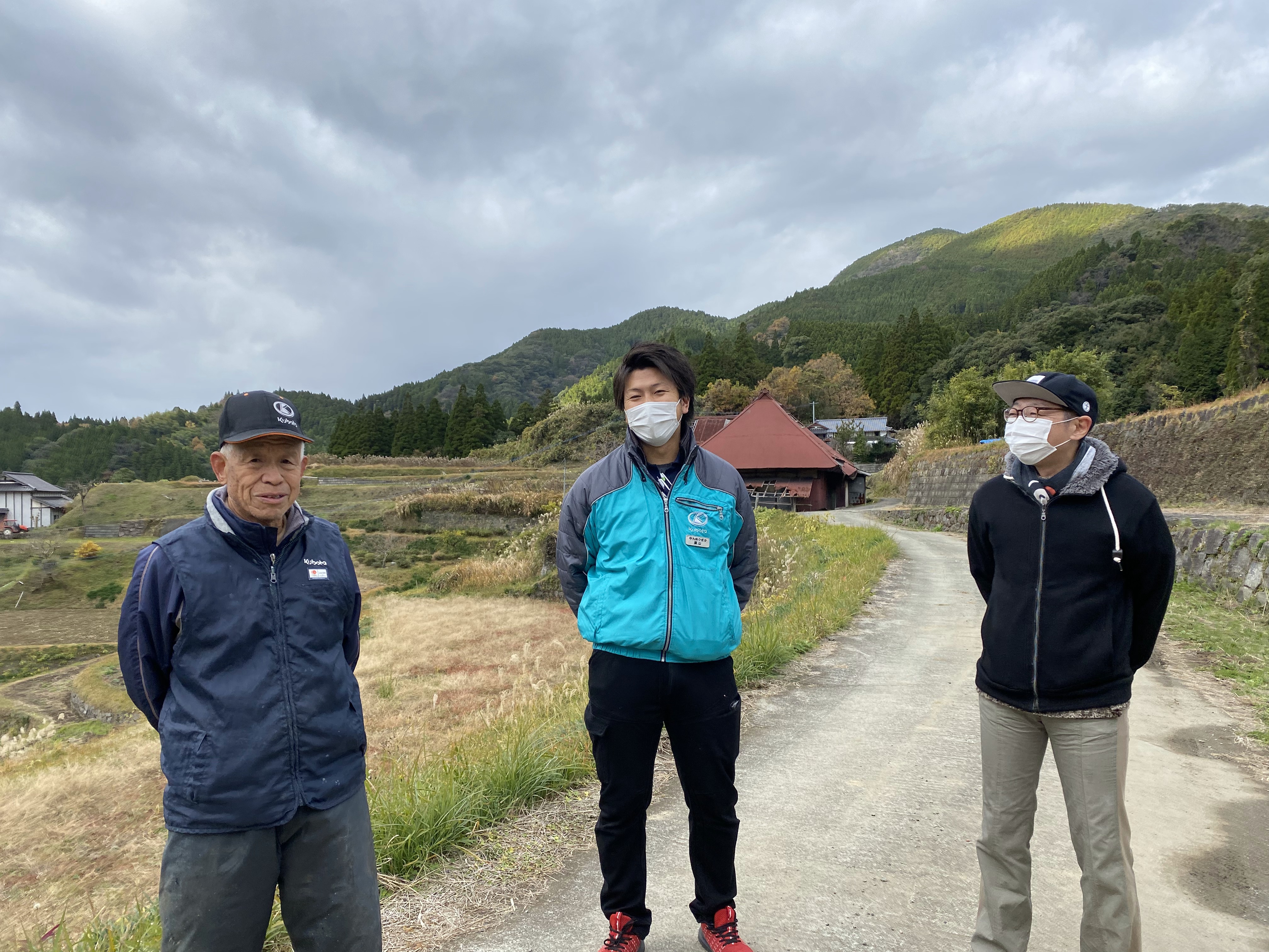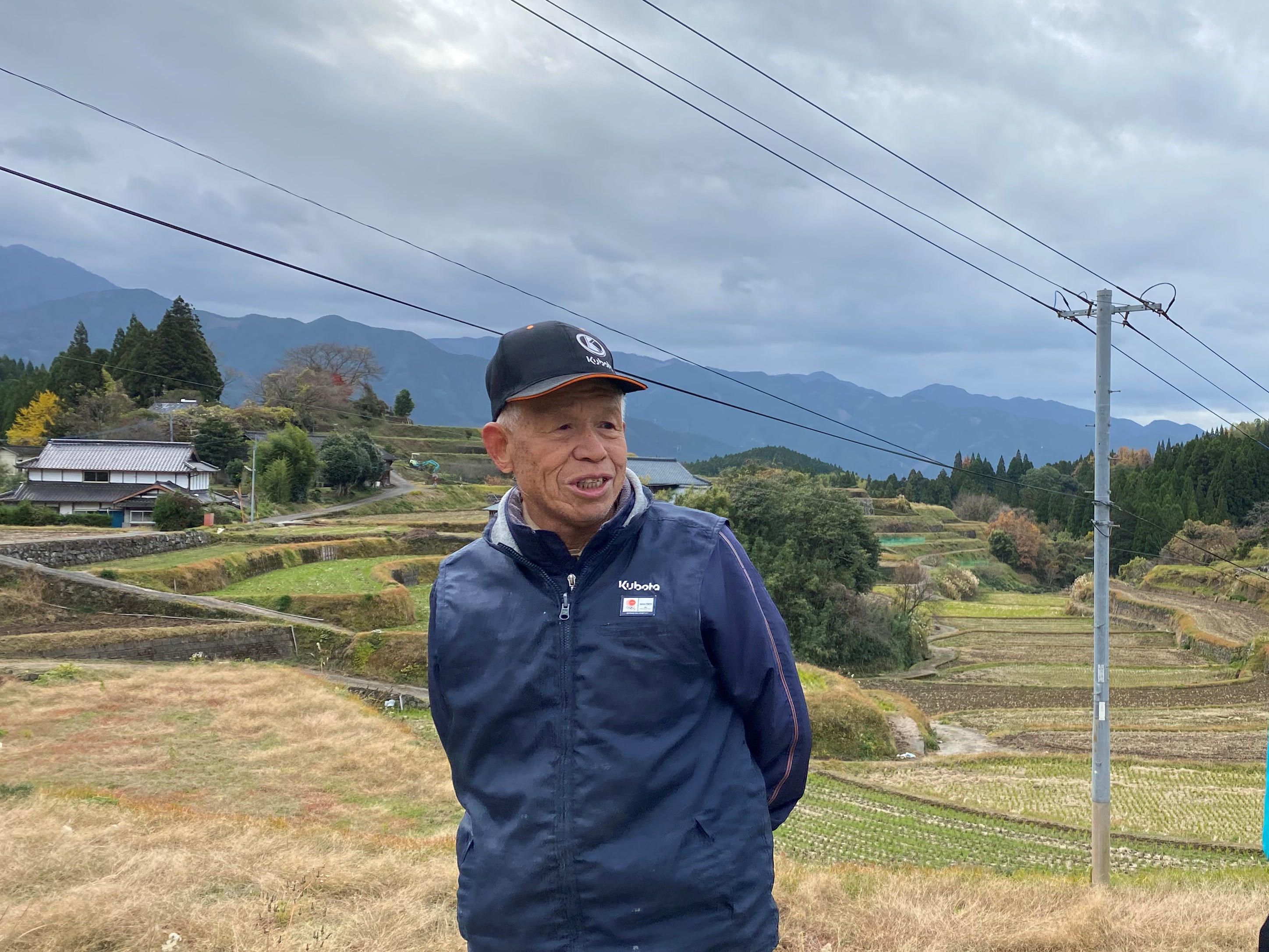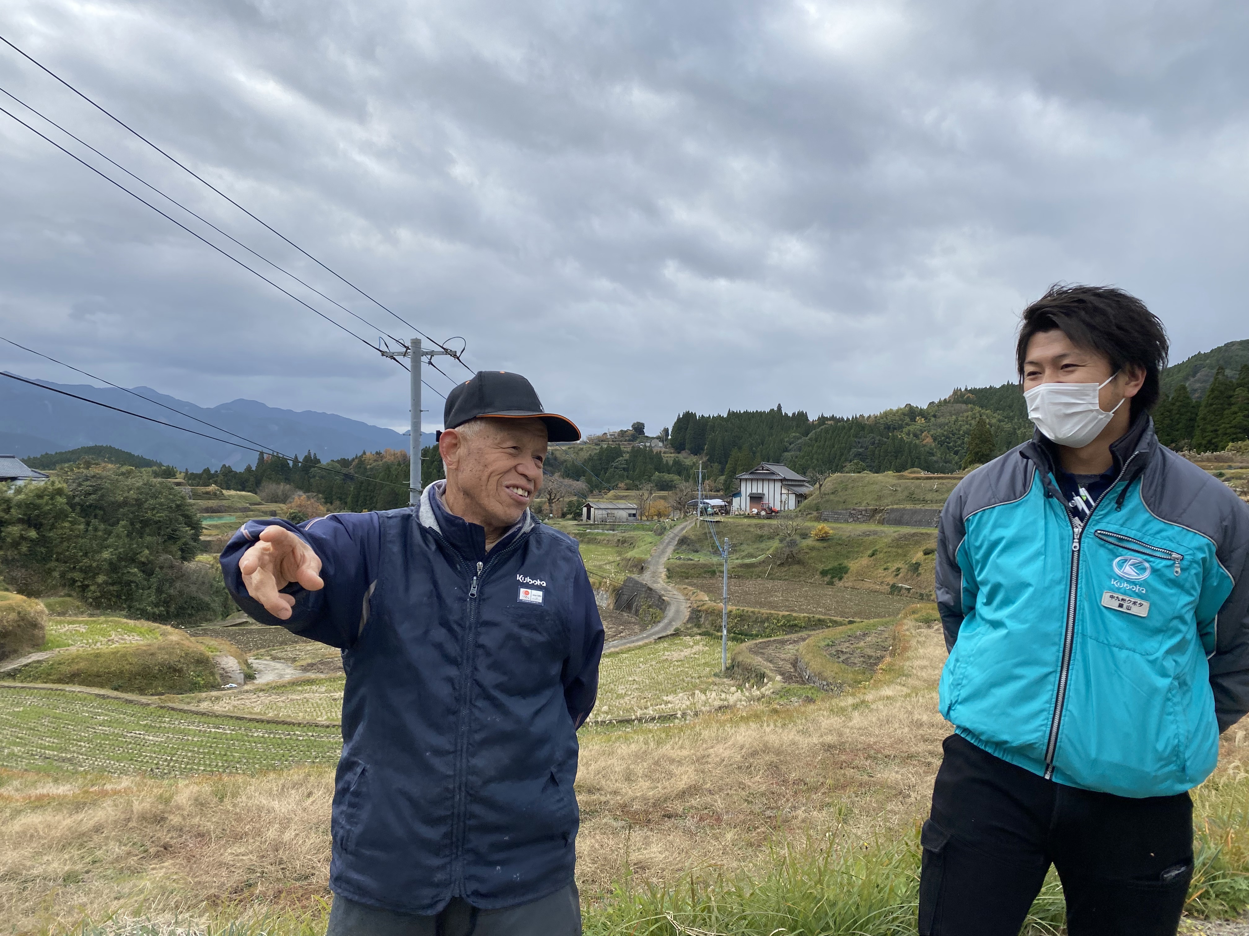 棚田という地形もさることながら高齢化が進む地域だからこそ、何気ない会話をして変わったことはないか?など地域の見守りにも貢献されている中九州クボタのお仕事。