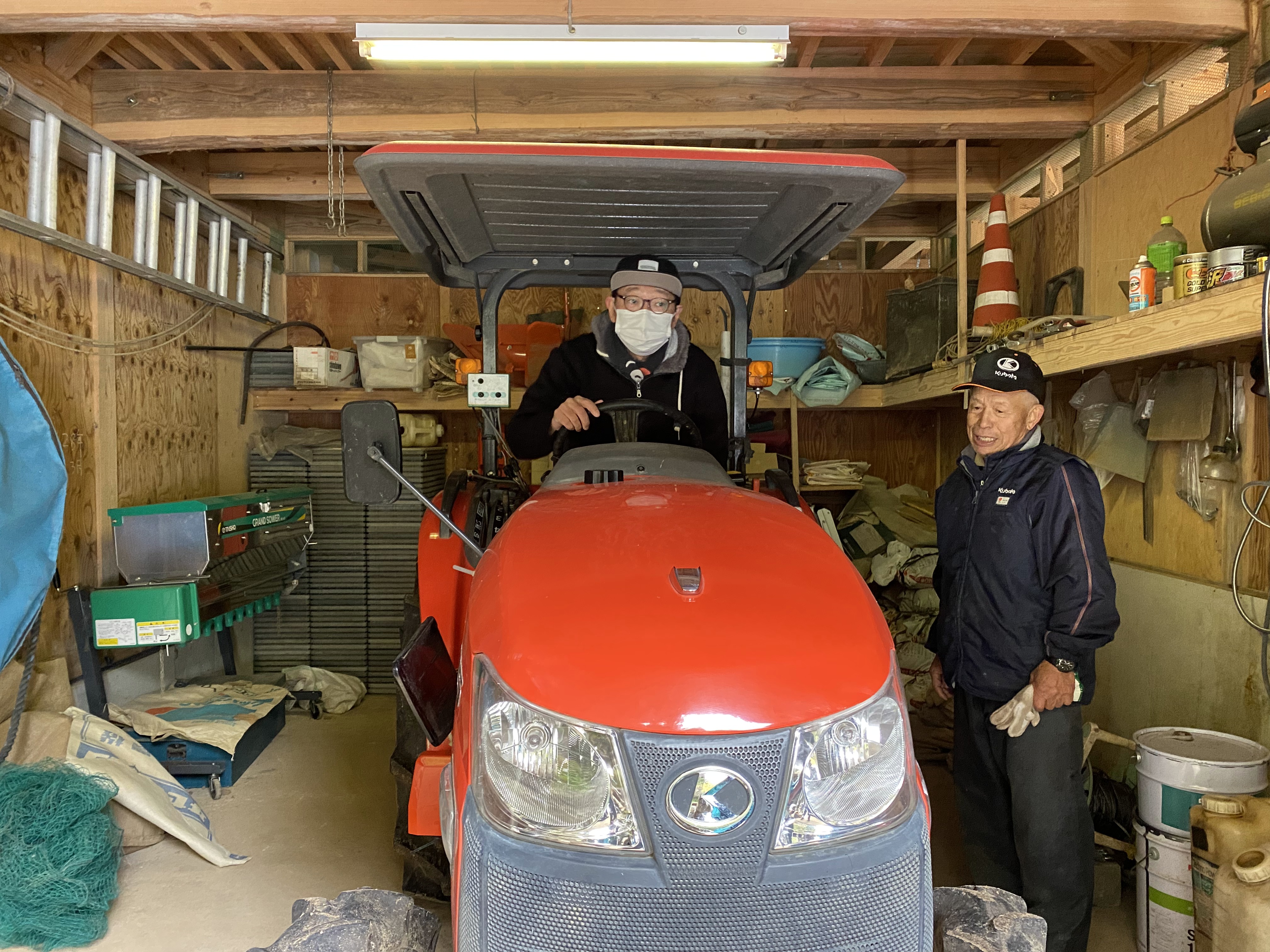 「昔は牛ひいてやっとったけど、今はトラクターよ!でなきゃとてもとても。ちゃんとこの形状に合わせたやつばクボタさんが探してくれたけん大丈夫」