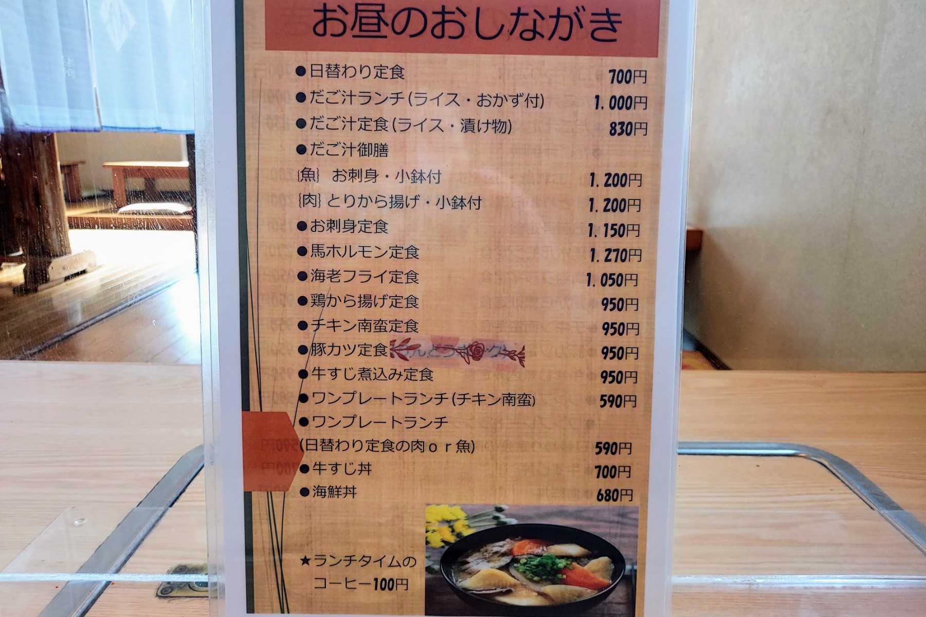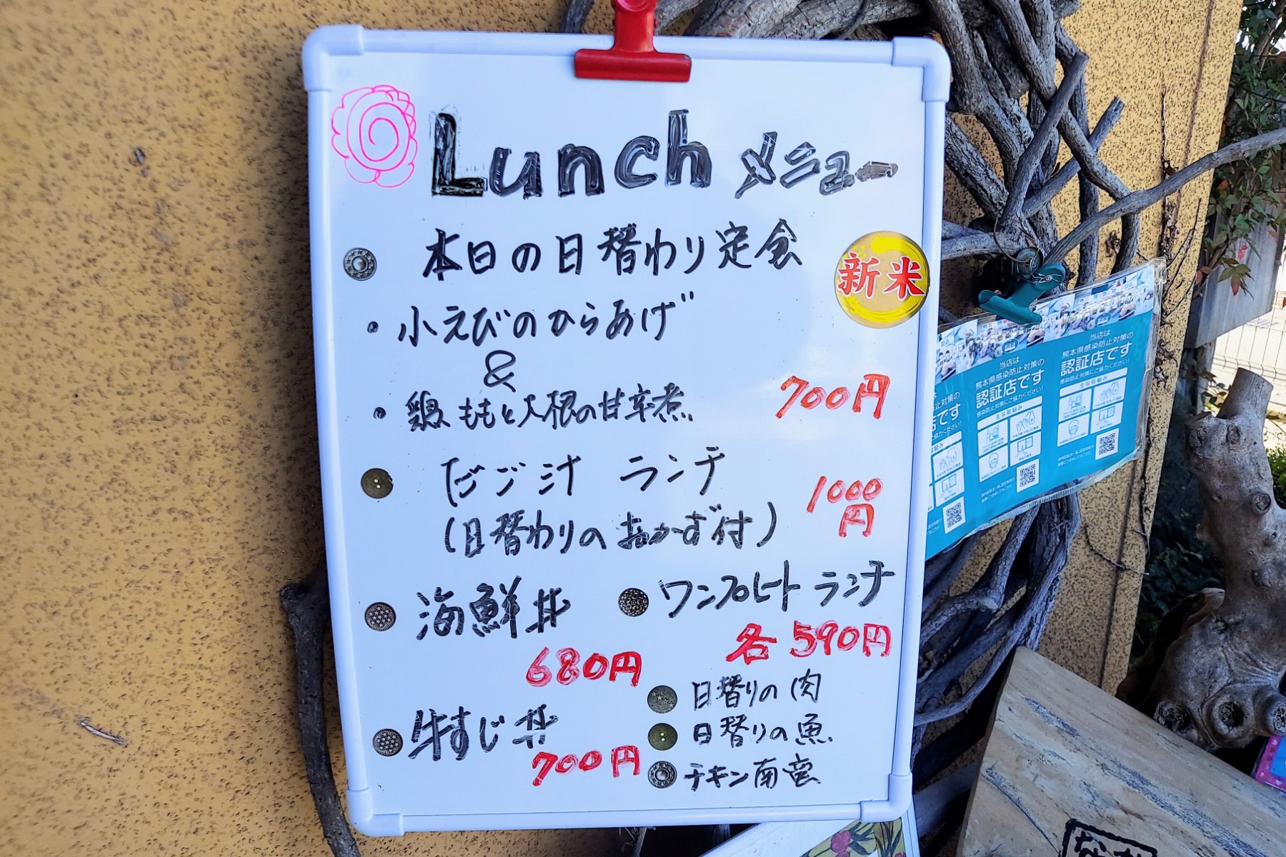 お店の入り口には日替わりランチのおかずが記載されているので見逃しのないように要チェックですよ!
