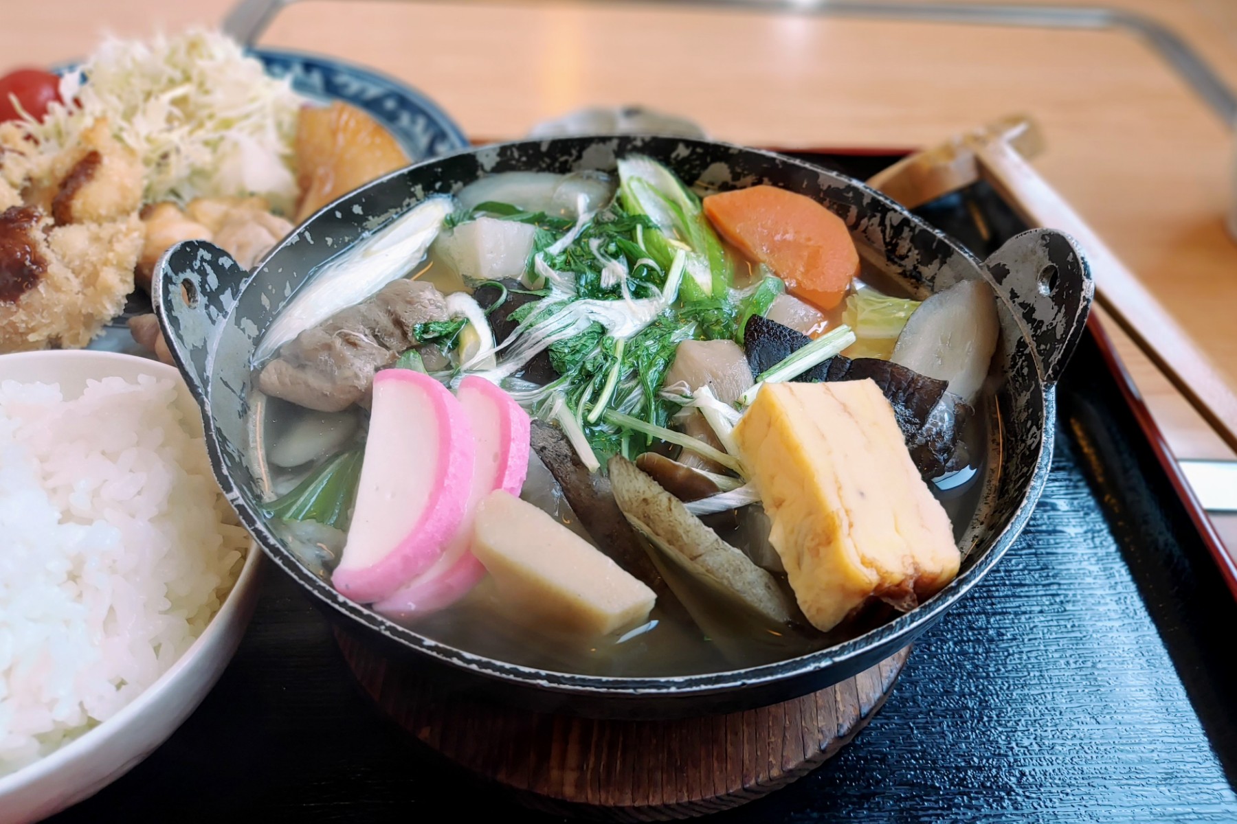 かまぼこ、しめじ、人参、鶏肉、ネギ、ごぼう、大根、椎茸、たけのこ、里いも、白菜、