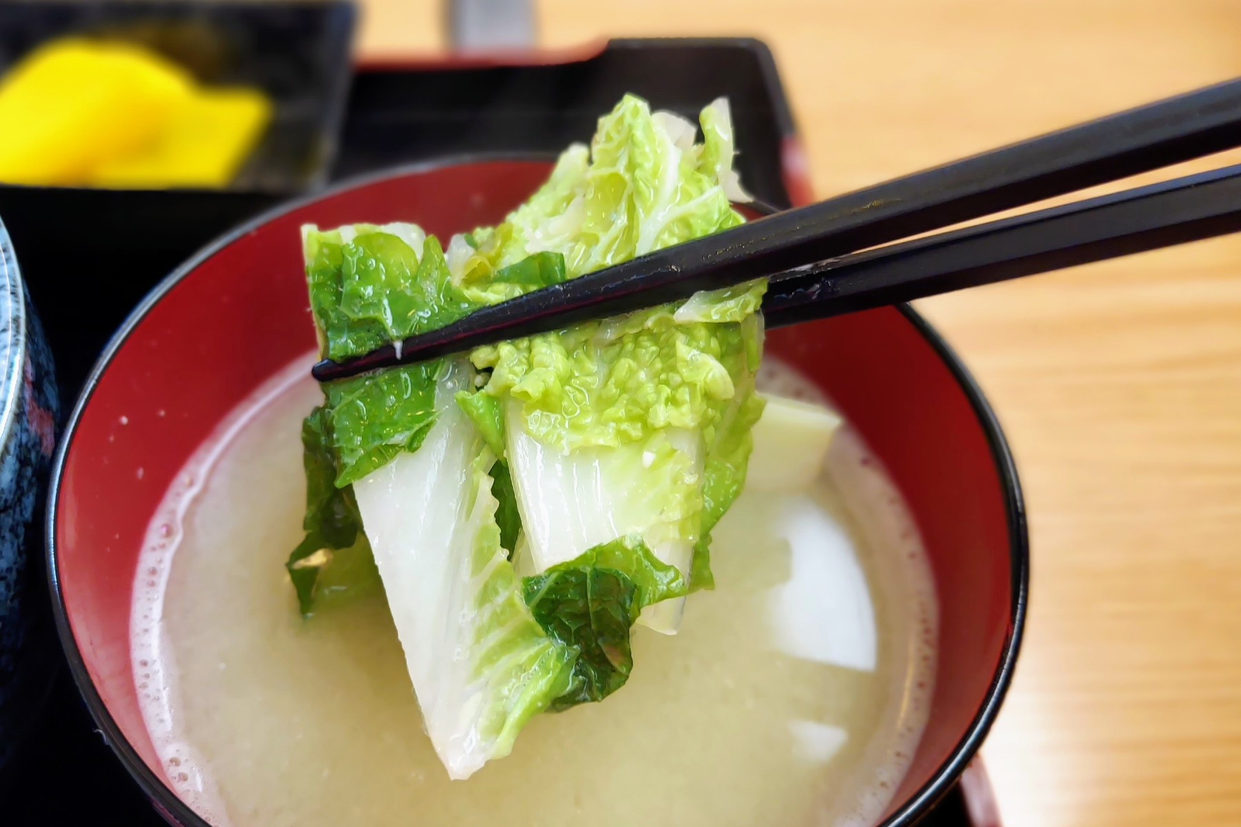 白菜たっぷりのみそ汁も家庭の味に飢えている私の心にクリティカルヒットでした。