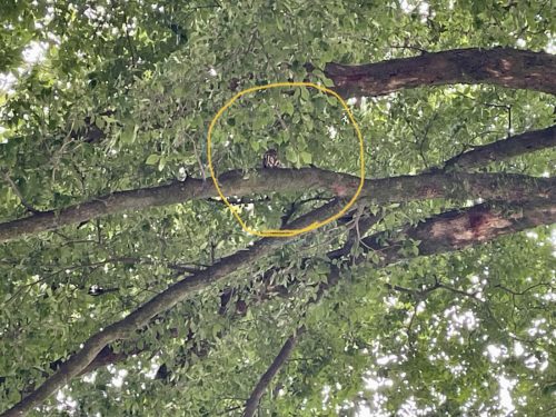 この木の中にお父さん、お母さん、兄弟でいるのを見ました。大きな木に巣を作ることから、おのずと神社の木に居る事が多いようです。昔は当たり前のようにいる鳥だったようですが、大きな木が少なくなってきたことから、生息数は減ってきているのではないかという事。