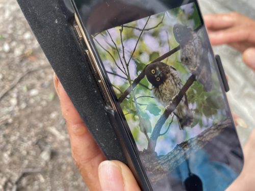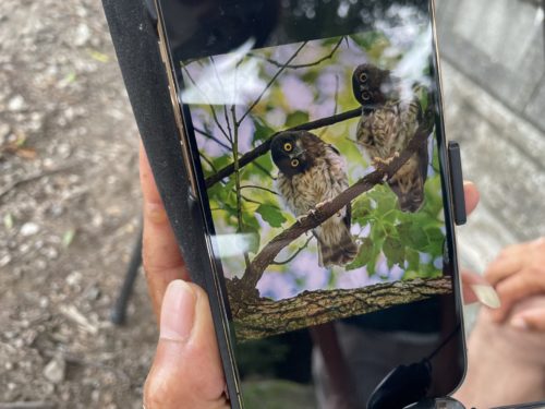 あ!いました。かわいい丸っこいシルエットです。かわいい!鳥網フクロウ目フクロウ科アオバズク属に分類される鳥だそう。揺れる木の枝にふさふさの毛が見えました。