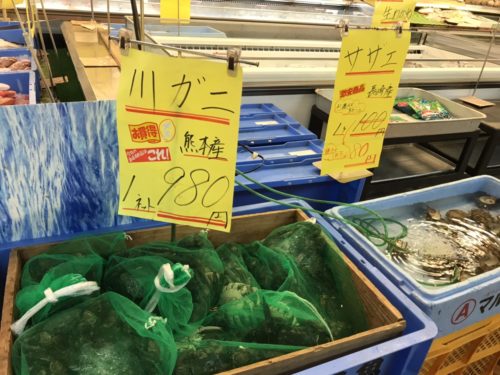 川ガニやサザエといった、スーパーではあまり見ない食材に、昆布などの乾物類までそろっています。