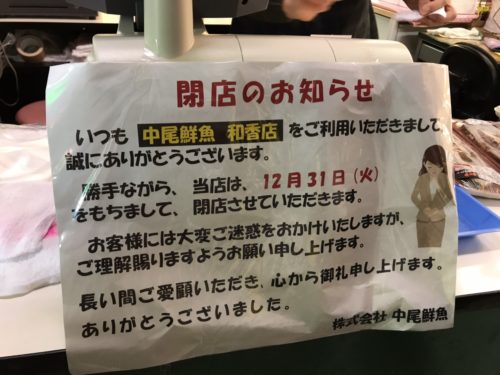 しかし残念ながら、12月31日をもって閉店することに…。なんとこちらのお店、50年以上営業されていたそうで、昔ながらの魚屋さんが閉店してしまうのは、本当に残念です。