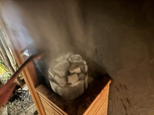そして、初めてのロウリュに思わず手が震えました…。