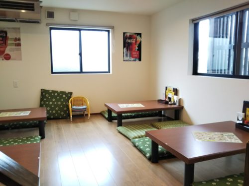 奥にお座敷があり、4名用テーブルが4卓。子ども用椅子完備。