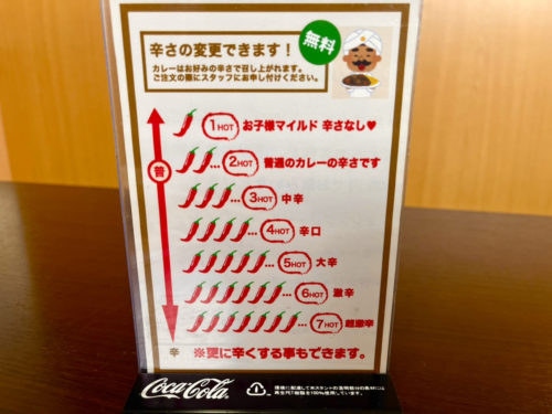 カレーの辛さはお好みでチョイス。超激辛の7HOTよりもさらに辛くすることもできるそう。2HOTが普通のカレーの辛さだと書いてあったので、辛いものが大好きな私は5HOT(大辛)にしてみました。
