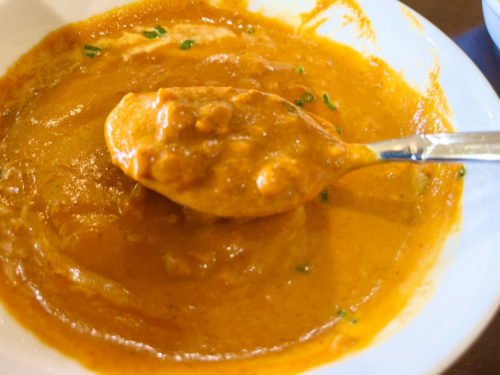 チキンベースのスープは、マイルドでとろみがあって野菜の食感も。サラダもマンゴーラッシーも最高でした。