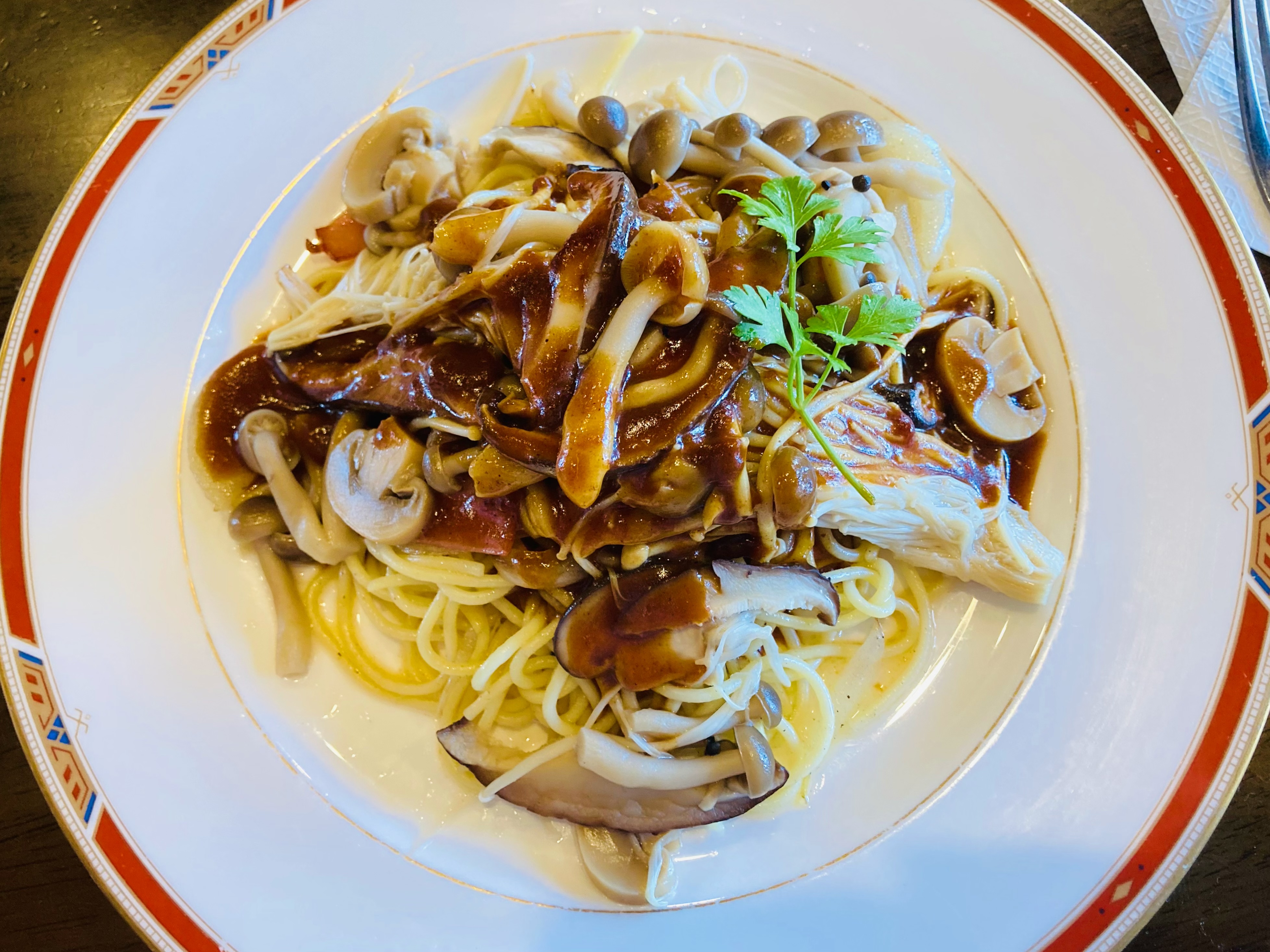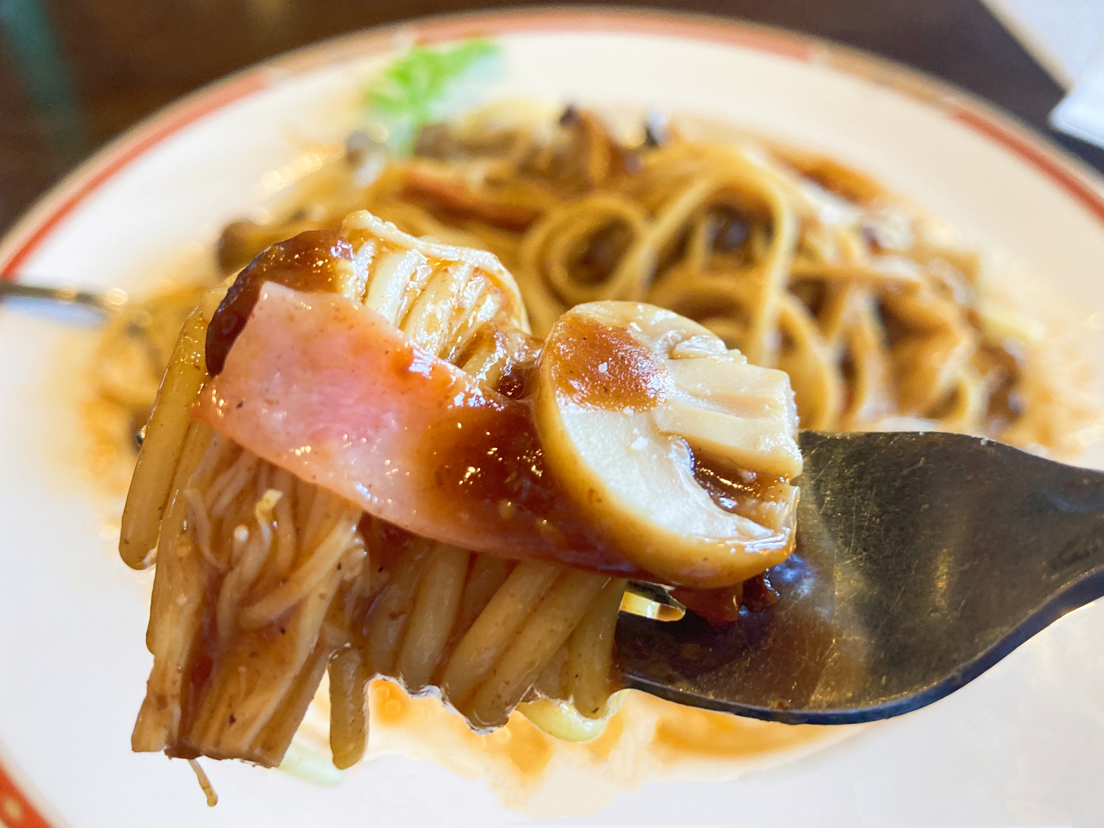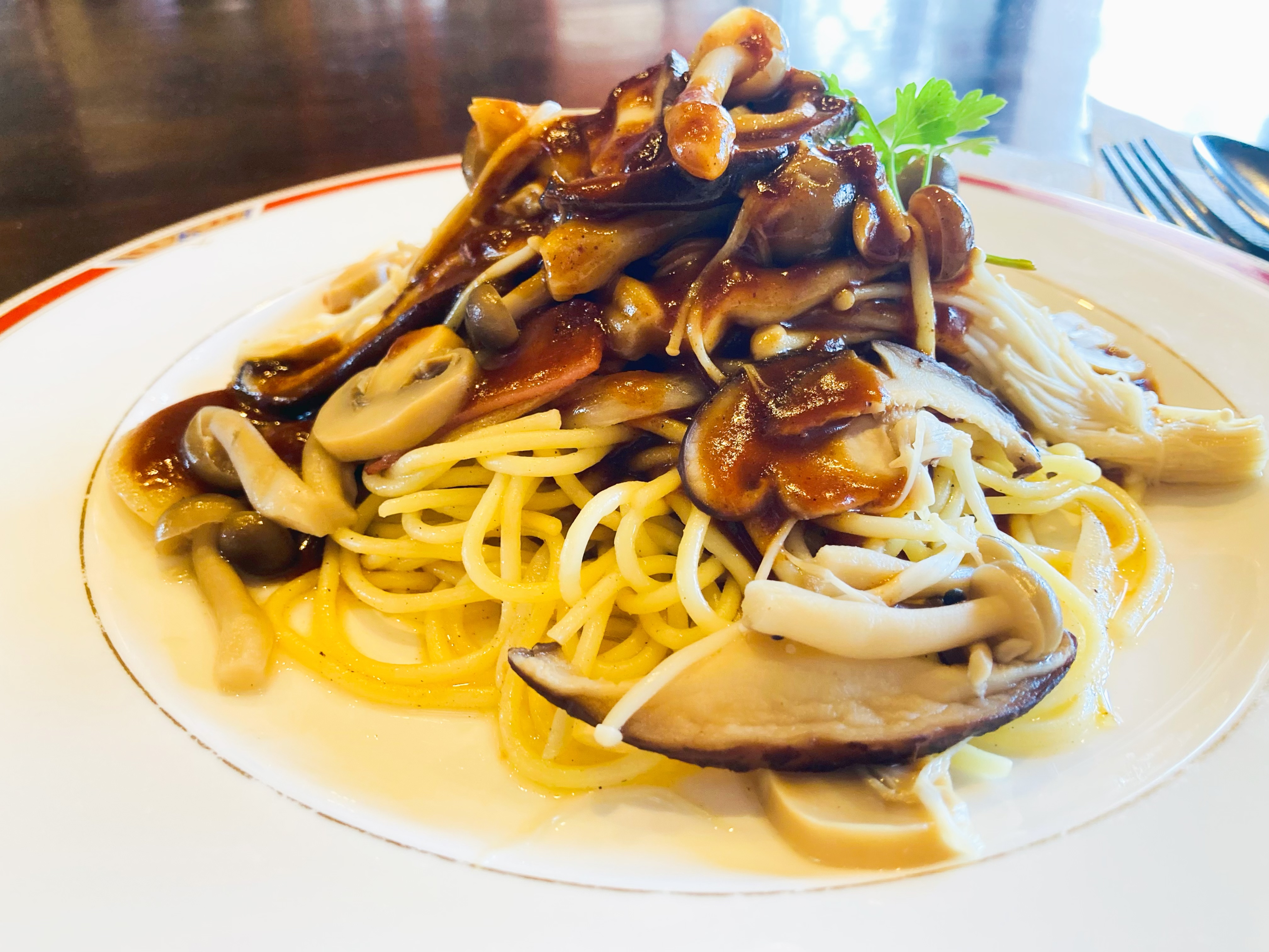 たっぷりのきのこにデミソースが掛かったスパゲティ。