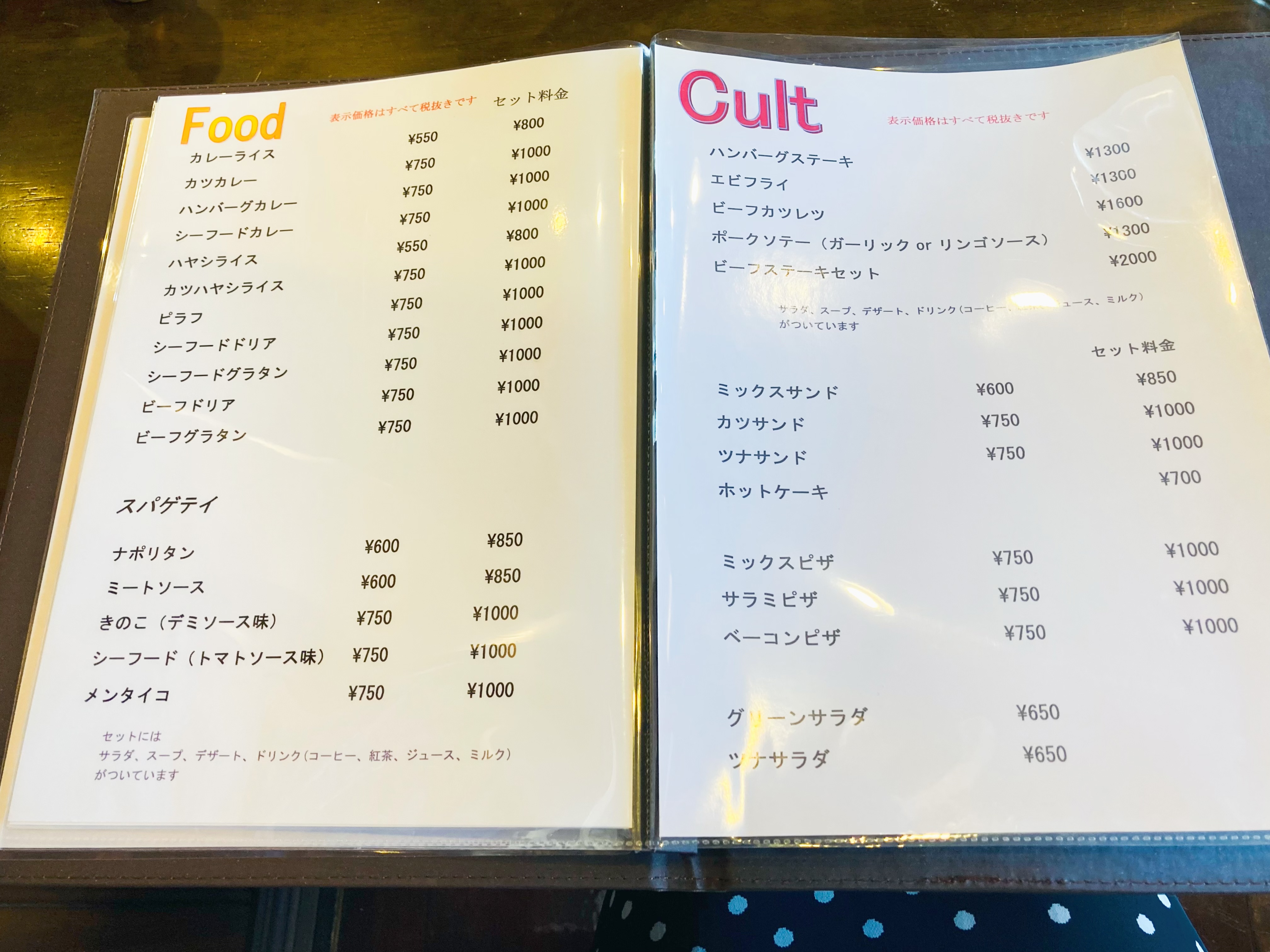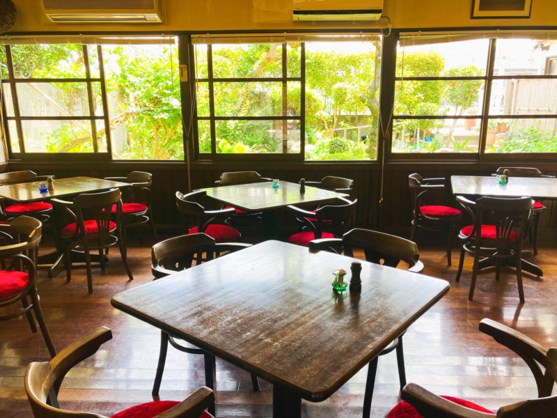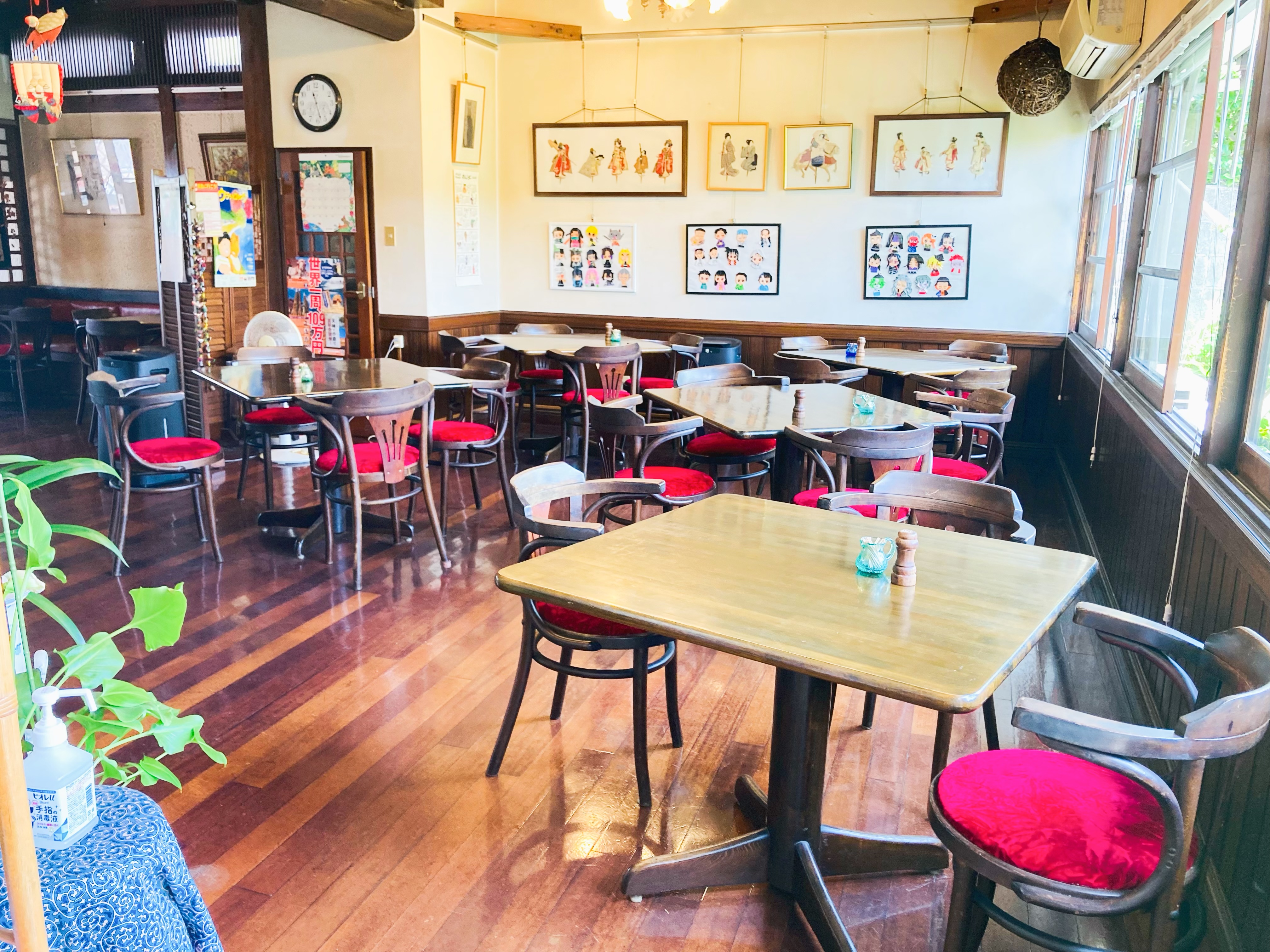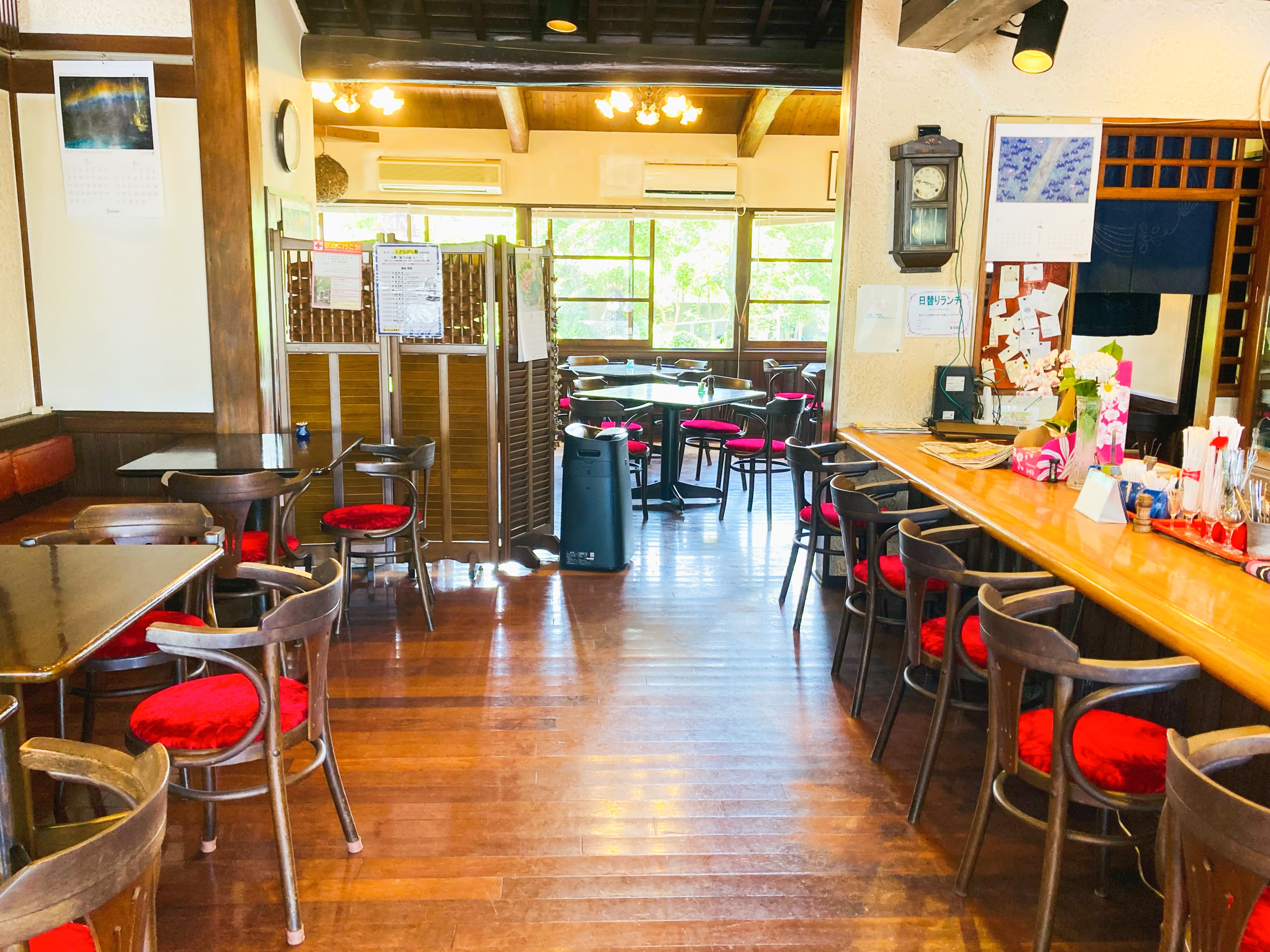 店内に入ると、抜群の雰囲気。木の柱がとってもレトロ。そして、使い込まれたテーブルとイス。イスのクッション部分が深紅なので、さらに雰囲気が出ます。