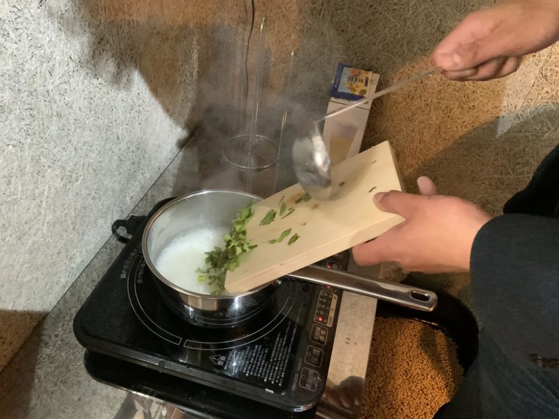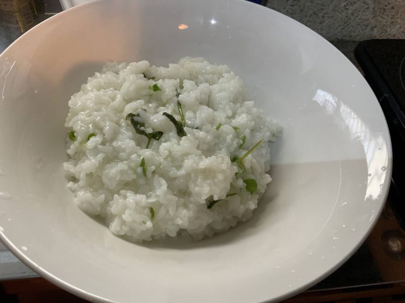 あれ。もうなんの期待もせずに作りましたが、見た目は案外行けそう。七草粥と言い張る、二草粥です。
