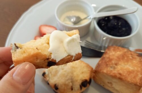 紅茶とスコーンにジャムとクリームが添えられた、「これ、絵本や映画で見たやつ!!」な一皿が出てきました。