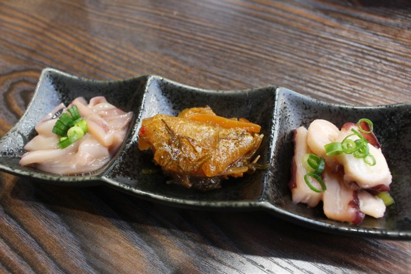ザンギの揚げ上がりを待つ間、「小樽珍味3種盛り(税込880円)」をアテに。イカの塩辛、松前漬け、タコわさび。