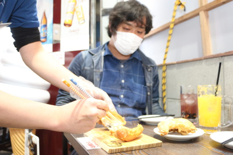 そして、いよいよやってきました名物「若鶏半身揚げ(税込1200円)」。先程のザンギもなかなかの大きさでしたが、こちらはその名前から分かる通り、鶏を半身まるっとあげているので、圧巻のサイズ感。どうやって食べるの?と思いますが…