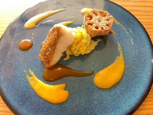 味覚だけでなく、視覚も楽しませてくれる華やかな盛り付けで、ソースも、黄カブのピューレに、グリーンレモンのソース、カブと貝のエキスを乳化させたソースなど、多様なソースがあしらわれていて、いろんな味で素材を楽しむことができます。