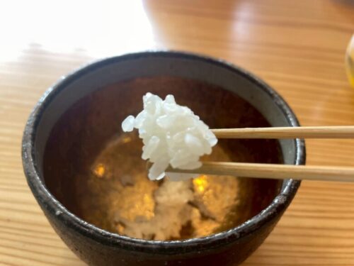 和食の世界で「煮えばな」と言われる、お米を蒸らす前の、美味しいご飯も一口いただきました。