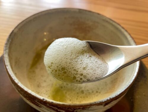 味付けは塩のみという、ネギの甘みと旨味たっぷりのスープを、貝のエキスのふんわりと仕上げられたエスプーマとともにいただきます。