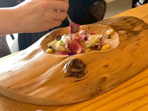 人吉産の大きな木の器に、彩り豊かな野菜とソースが盛られていて、なんとも芸術的!