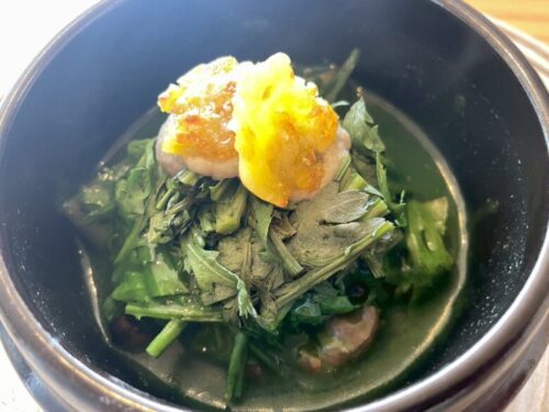 たっぷりと盛られた春菊とスープの中に、地元人吉にあるこだまの地鶏に、肉厚の椎茸や牛蒡が入っていて、春菊の華やかな香りとともに、地鶏の旨味を存分に楽しめます。