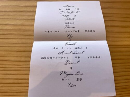 春菊や鹿肉、さがら味噌などが、どのようにお料理になって提供されるのか、これを見るだけでも期待が高まります。