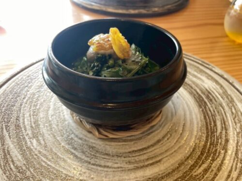 南阿蘇にある椛島農園の新鮮な春菊の鼻に抜ける香りが素晴らしく、つぶして焼いた銀杏もトッピングされていて、季節を感じさせてくれる逸品。牛蒡もコンフィにしたものを、さらに炭火焼きされるなど、手間暇かけて作られたお料理です。
