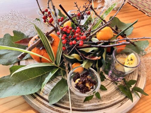 柿や金柑、南天など、季節感いっぱいのお皿に盛りつけられた、パッションフルーツソースでいただくセロリのアイスと、ココアのクランブルがトッピングされた唐芋のお菓子。セロリがこんなにも美味しいアイスに変身するなんて!と、最後まで驚きと感動の連続!