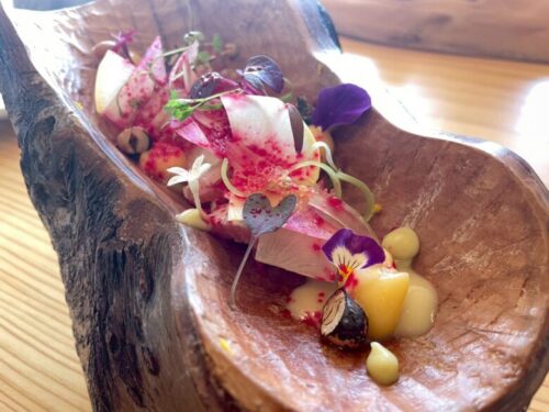 提供時に目の前で、凍らせたビーツのドレッシングをかけていただく演出もあり、ビーツの赤が映えるアーティスティックなサラダに、気分も上がります。「楽しい」と「美味しい」が一気に押し寄せてくるようなお料理です。