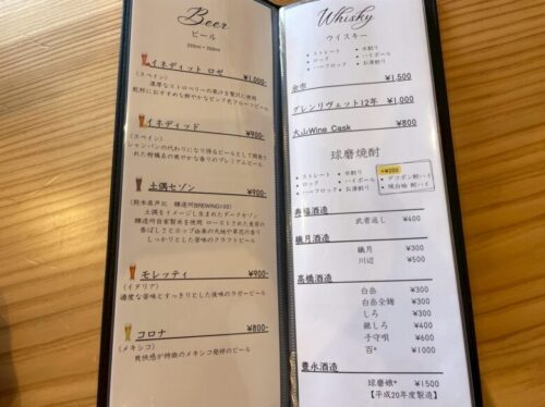 シャンパンにクラフトビール、ウイスキーにワインから、少量から気軽に飲み比べを楽しめる球磨焼酎(300円~)まで、アルコールの種類も豊富なので、お食事と一緒に、お酒も幅広く楽しんでいただけます。