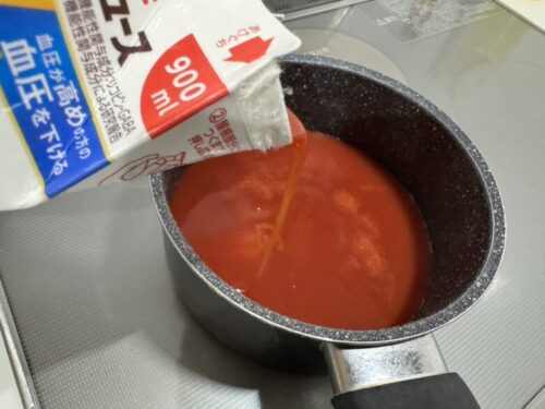 晩御飯は、すりおろしトマトの、トマトジュース煮込み。