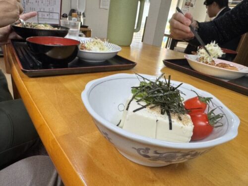 隣で丼と味噌汁食べてる人をおかずに豆腐をいただきました。