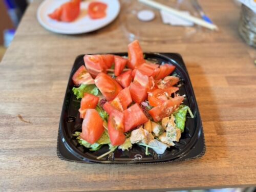 大量トマトをトッピングしたサラダ!皿の右端に鶏肉様がいらっしゃるのですが、久しぶりのお肉にそれはもう脳がマハラジャになる美味さでした。