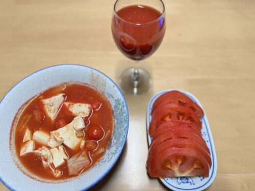 ミニトマトと豆腐をトマトで煮込んだスープとスライストマトとトマトジュース。