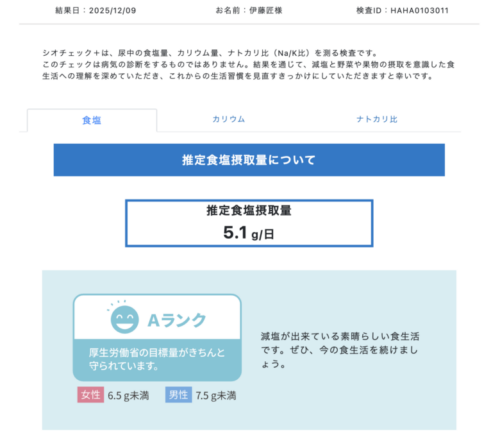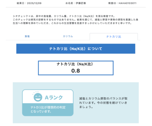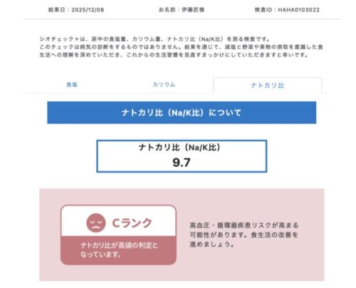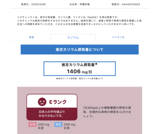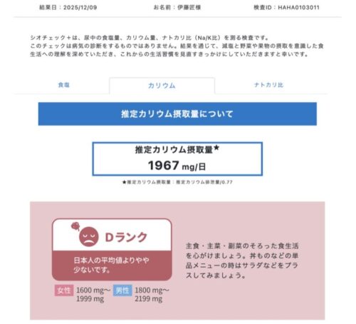 Dランクではあるものの、数値を見ると上がってます!ナトカリバランスの取れた野菜中心の生活を続けると、もっと改善されるんじゃないでしょうか。