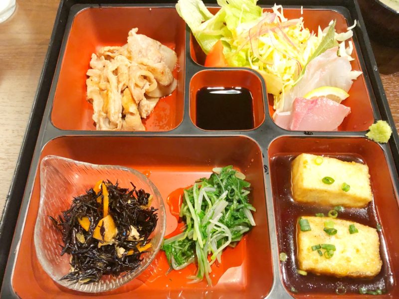 その中から、揚げ豆腐と豚のしょうが焼きを選択しました。お重に入っていてまるで料亭に来たかのような気分に。