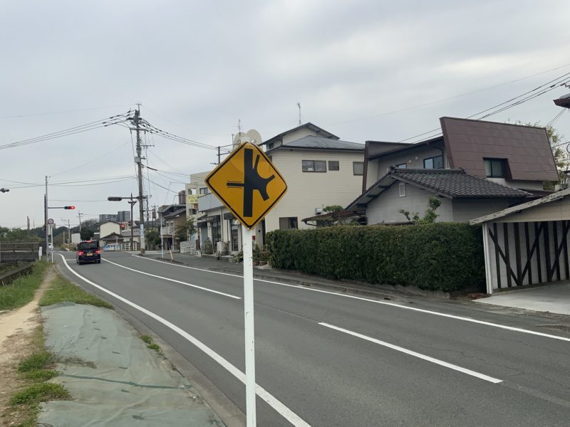 この場所は昔からある従来の道路と川に沿ってできた新しい道路が交わり、複雑な交差点になっているため、注意してくださいねって意味で設置しているそうです。