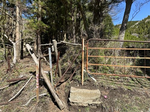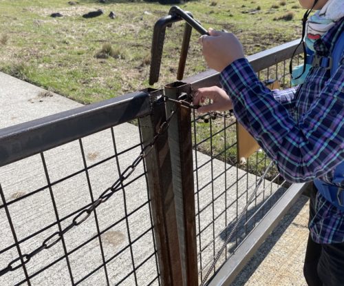 放牧地を通り、登山口へ向かいます。放牧地の入り口には鉄のゲートがあります。
