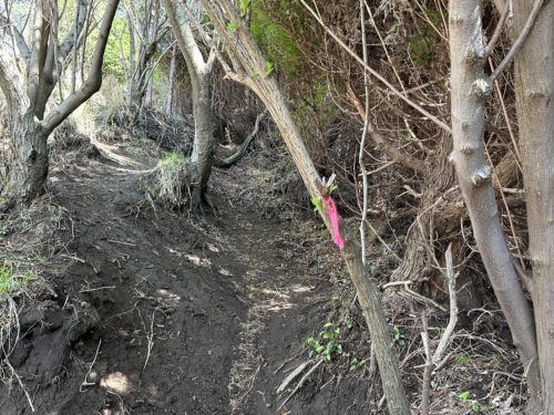 山には看板などはあまりないので、人が歩いた道や目印のリボンなどを見ながら登ります。