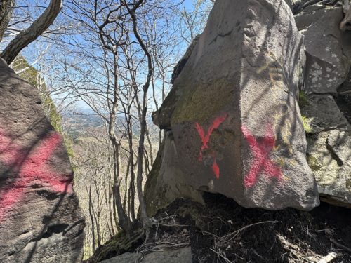 黄色の矢印の方向が正しいルート。どうやって登るのか近くへ行くと‥