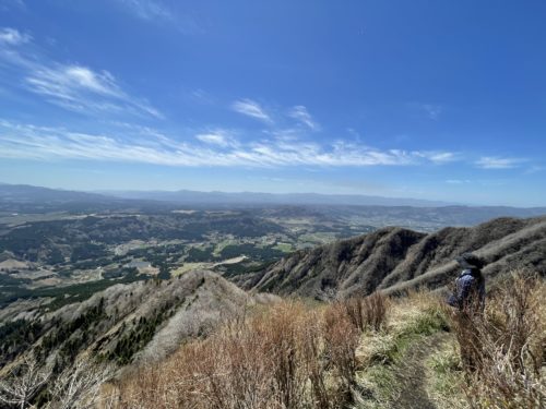奥の煙が出ている山が中岳でしょうか。外輪山が取り囲む風景を見渡すことができます。