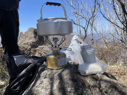 ちょうどお昼になったので、お湯を沸かしてコーヒーと軽食を食べて下山します。山頂で飲むコーヒーは格別です!