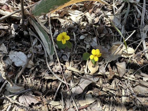 滑りやすい足元をよく見ると、新芽を吹いた木々や小さな花が咲いています。